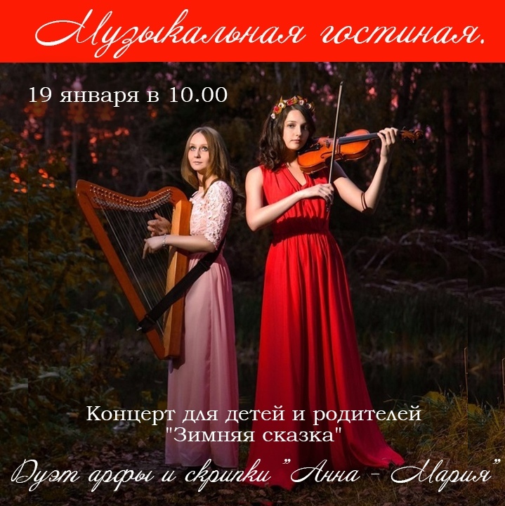 В это воскресенье, 19 января , приглашаем больших и маленьких любителей Музыки на новую встречу в нашей Музыкальной гостиной. "Зимнюю сказку" подарит нам волшебный дуэт арфы и скрипки "Анна - Мария". Вместе слушаем Баха, Вивальди и любимые Рождественские мелодии. А ещё споём колядку под гусли - в завершение Святочных дней!